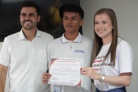 Representante da Lotep, Taciana Marinho, entregando o certificado para um dos vencedores do concurso; à esquerda, o Secretário de Educação, Wilson Filho. Imagem: Laura Moura.